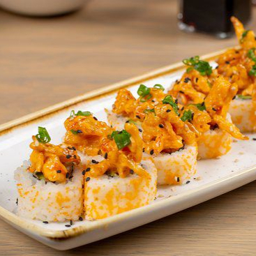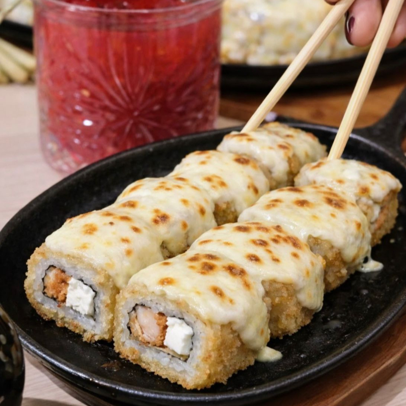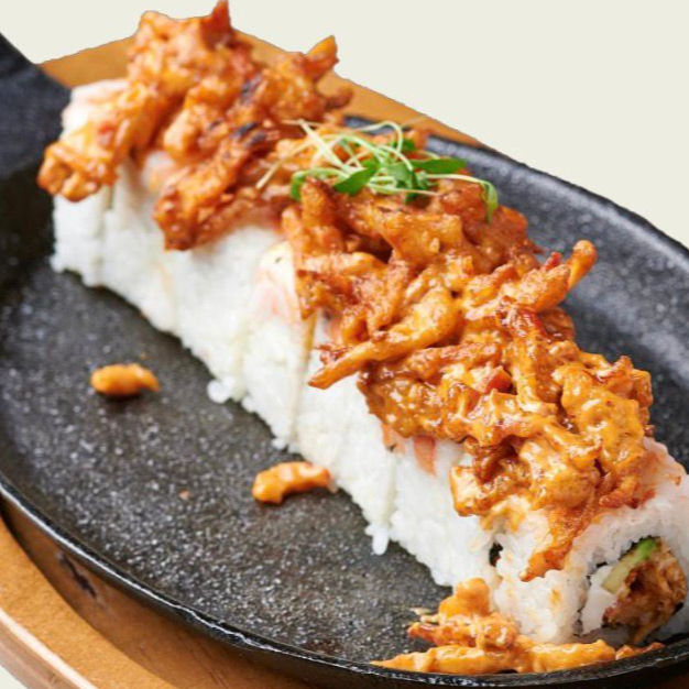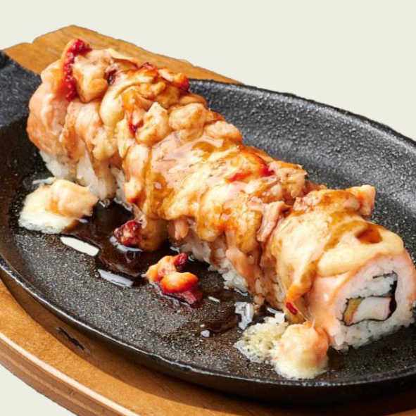 Surimi, queso crema y aguacate por dentro, porfuera queso oaxaca con topping de camaron y champiñones en salsa de especias y chile de arbol.