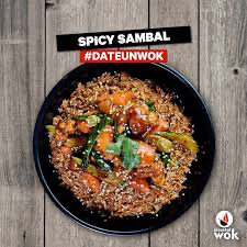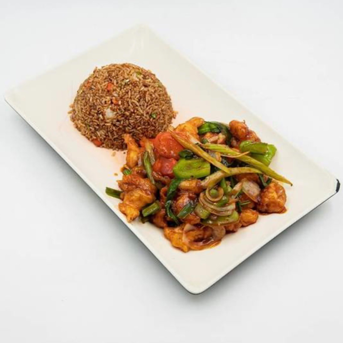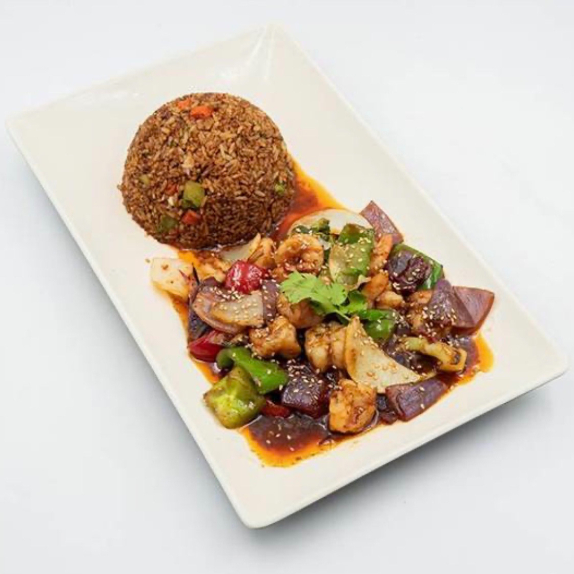 Delicioso platillo de pollo en salsa estilo sambal hecha a base de chiles asiáticos con una mezcla de morron verde rojo y un toque de ajonjolí tostado, todo esto sobre una base de arroz frito
