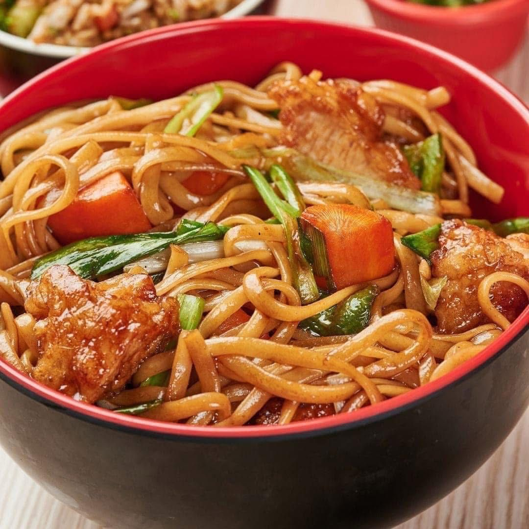 Noodles con pollo, zanahoria, pimiento verde, cebolla cambray, salteados en salsa de ostión dulce y soya.