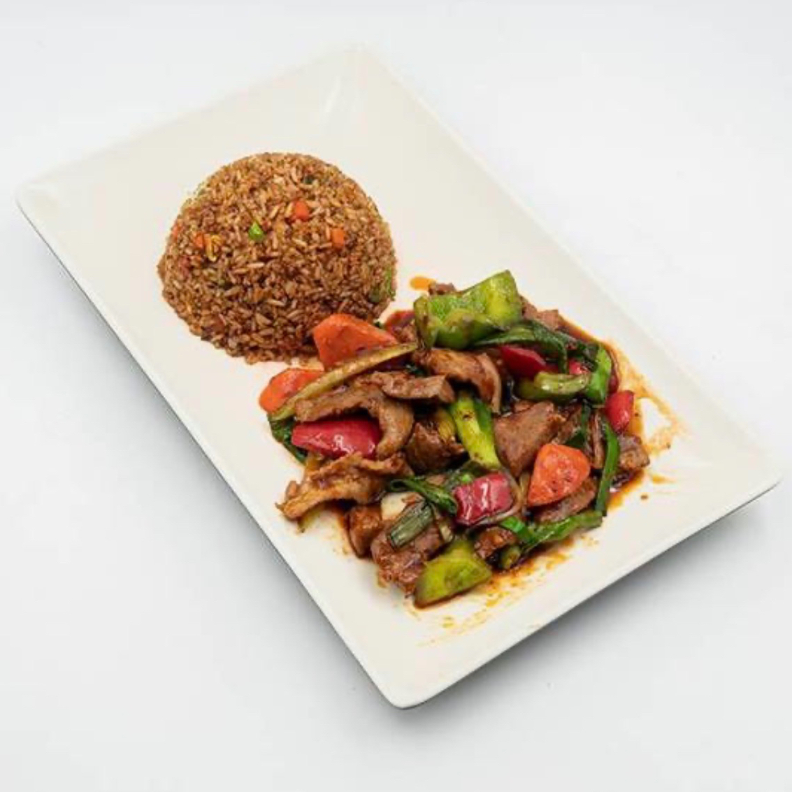 Delicioso salteado de res en una salsa de soya picante acompañado de tomate, cebolla morada, brócoli, jalapeños y papas. Incluye arroz blanco o frito