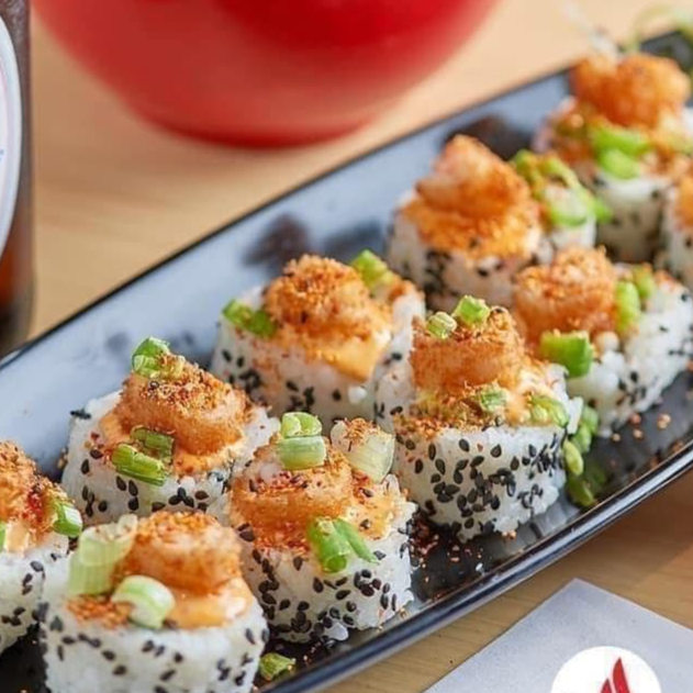 Roll picante y crujiente, relleno de pasta tampico, forrado con laminas de atun fresco, decorado con camaron capeado, con toque de picante serrano
