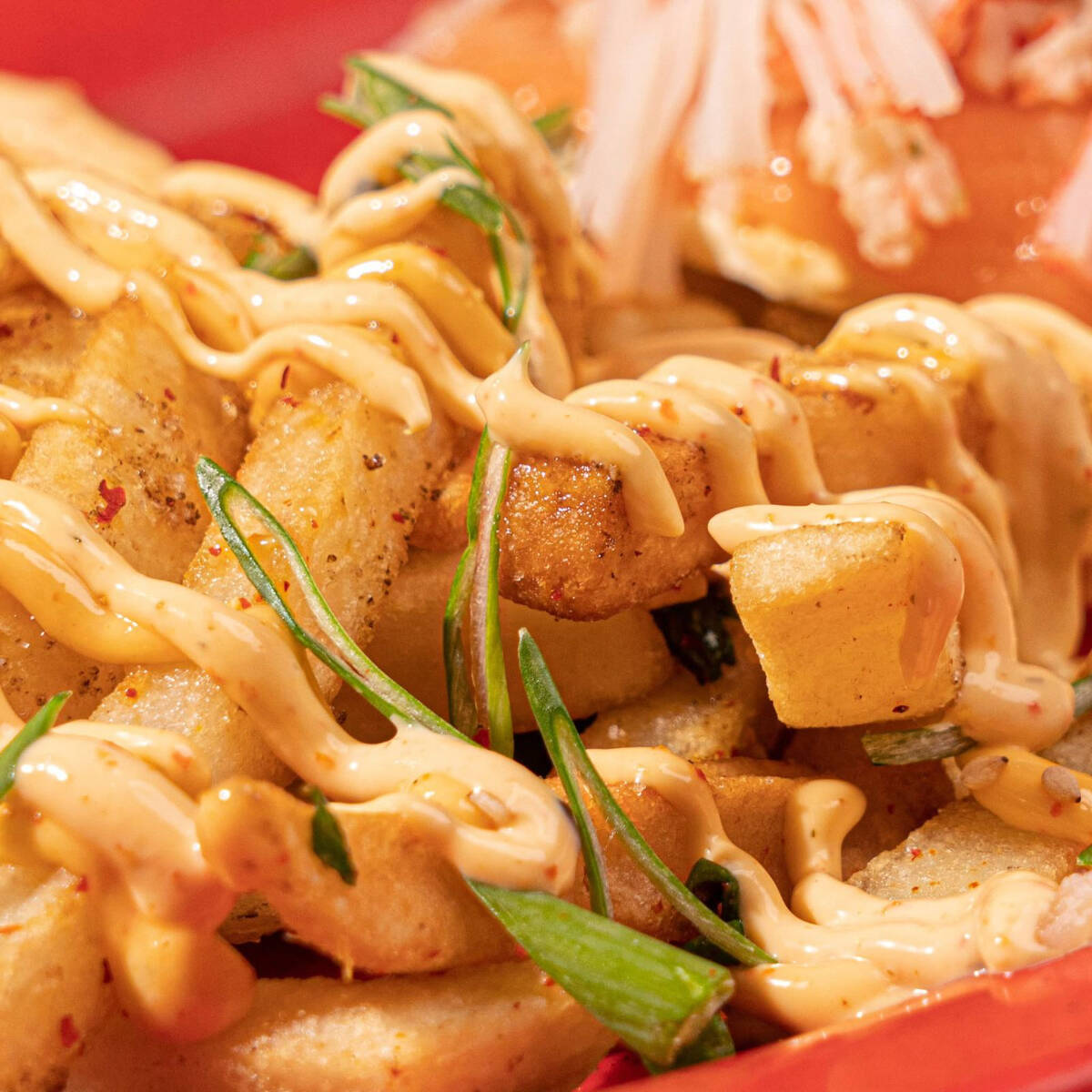 Crujientes papas a la francesa salteadas con un toque de ajo y una pisca de chile de árbol bañadas con nuestro delicioso aderezo de la casa.