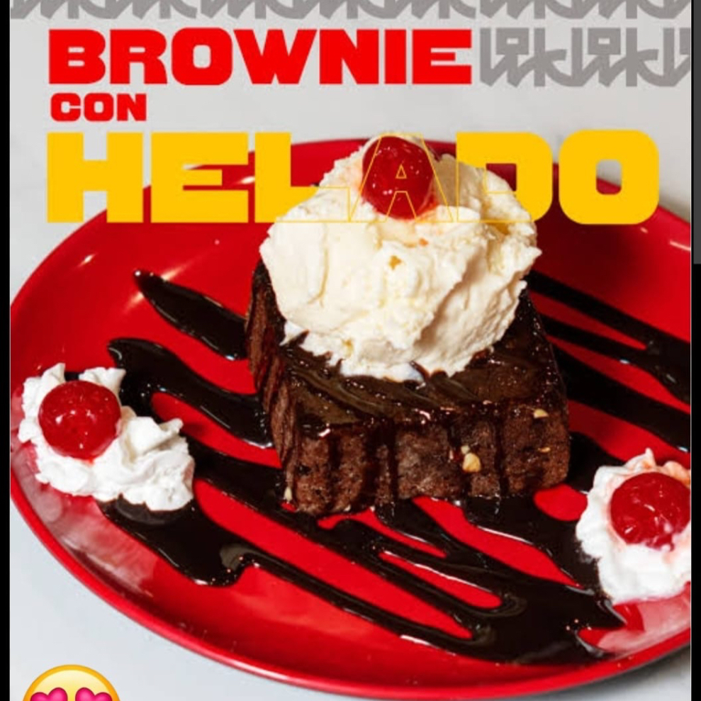 Tradicional brownie de chocolate con trocitos de nuez, servido con nieve sabor vainilla decorado con chocolate, caramelo líquido y cacahuate.