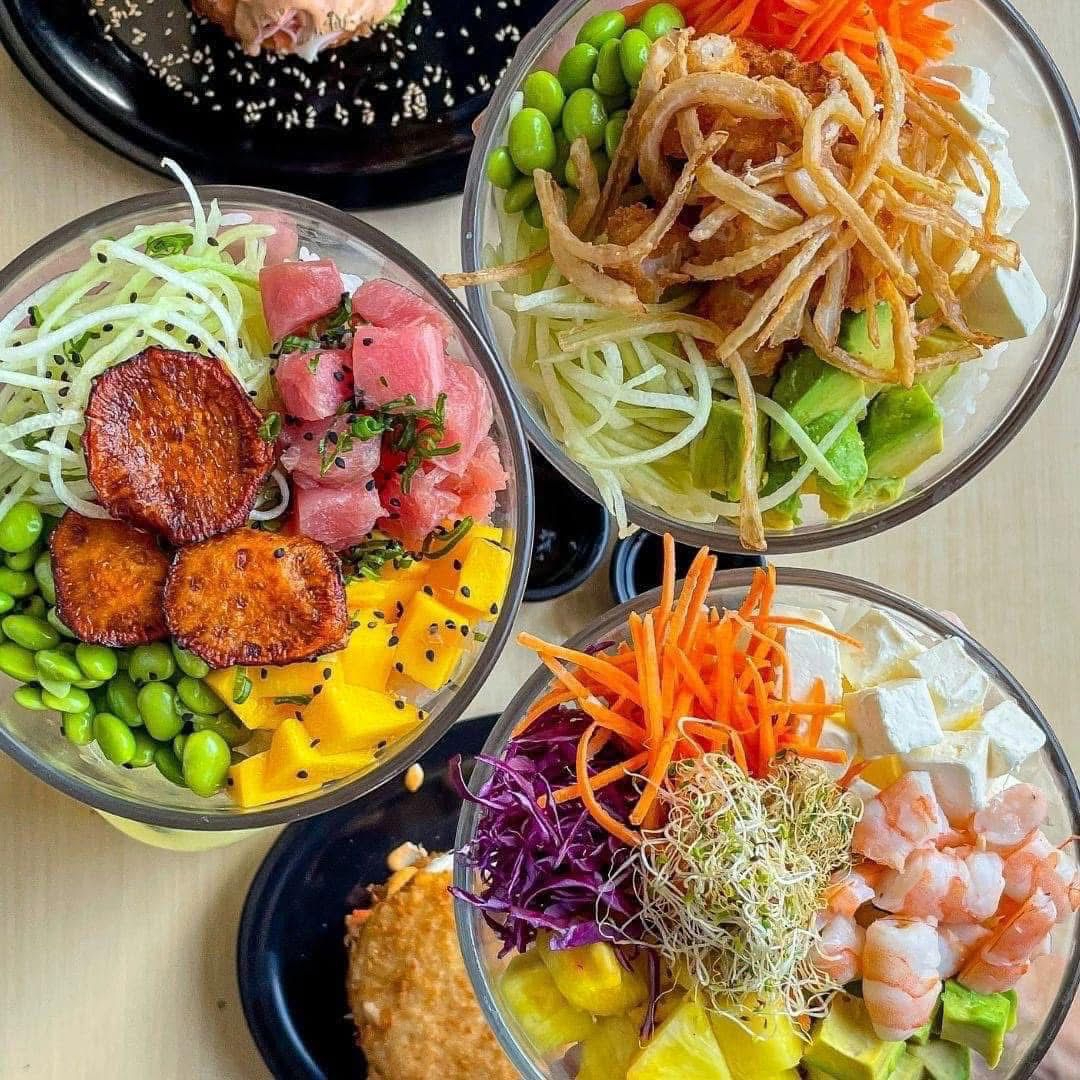 Base arroz japonés, proteína camarón roca con topping cebolla empanizada, aderezo roca, ingredientes como aguacate, edamames, zanahoria, queso crema y pepino.