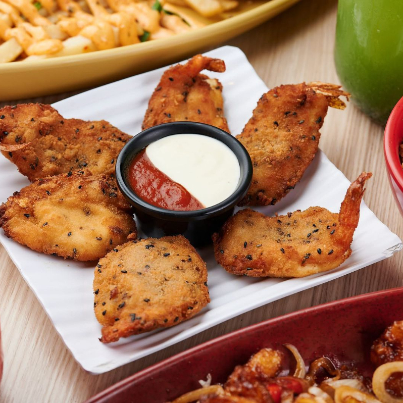 Camarones empanizados rellenos de queso crema.