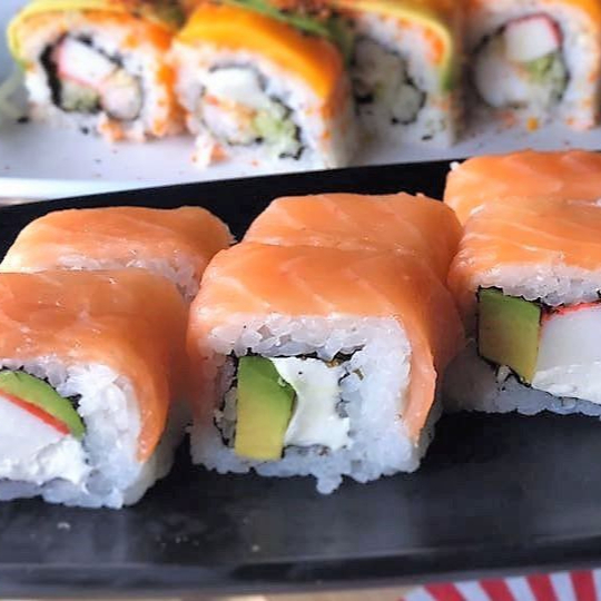 Surimi. queso crema, aguacate y pepino por dentro, decorado con salmon