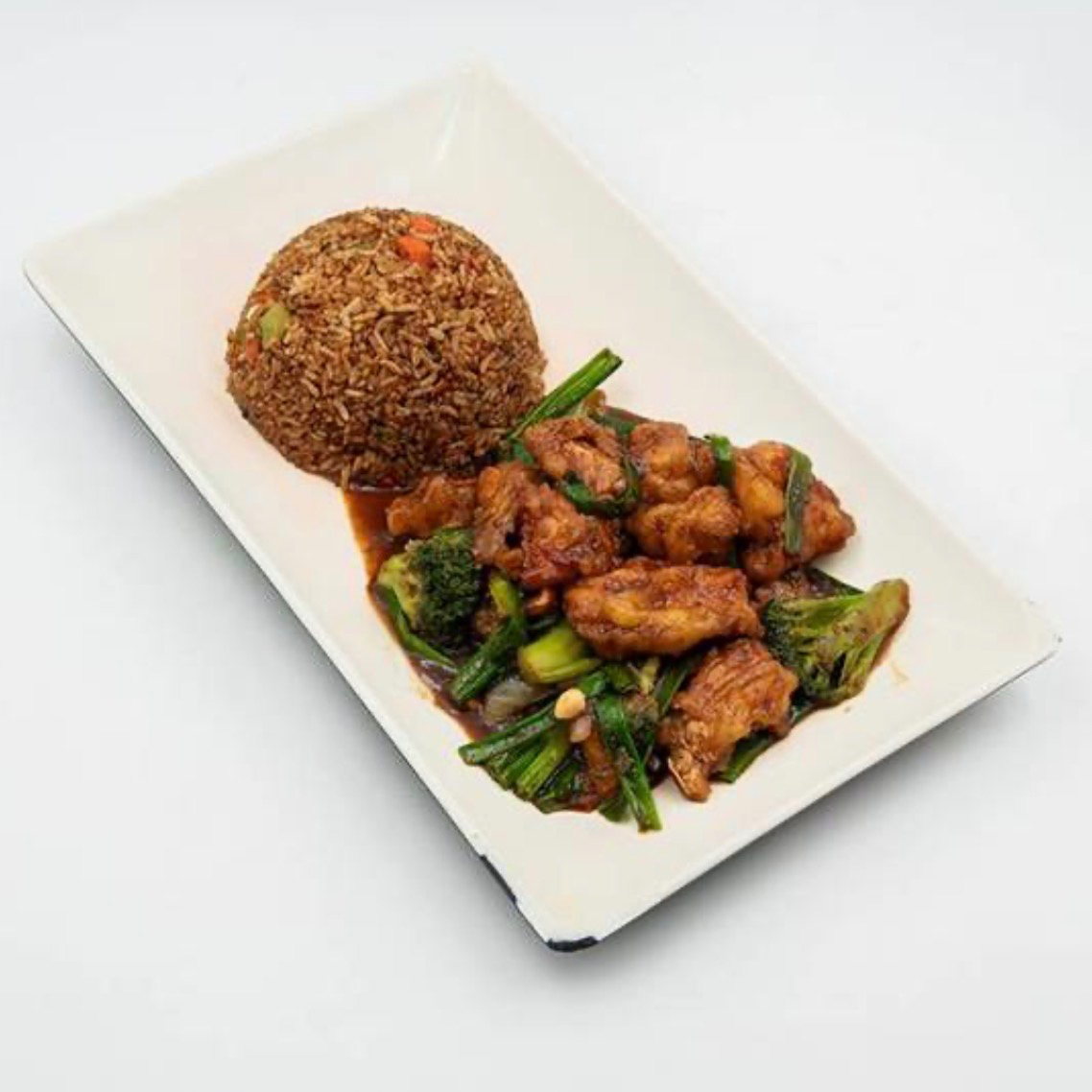 Pollo en salsa kung pao con brócoli, cacahuate y cebolla cambray. Incluye arroz blanco o frito