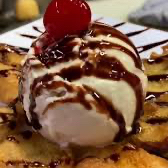 Deliciosas rebanadas de plátano frito acompañadas de nieve sabor vainilla y rico chocolate Hersheys.