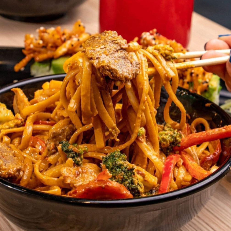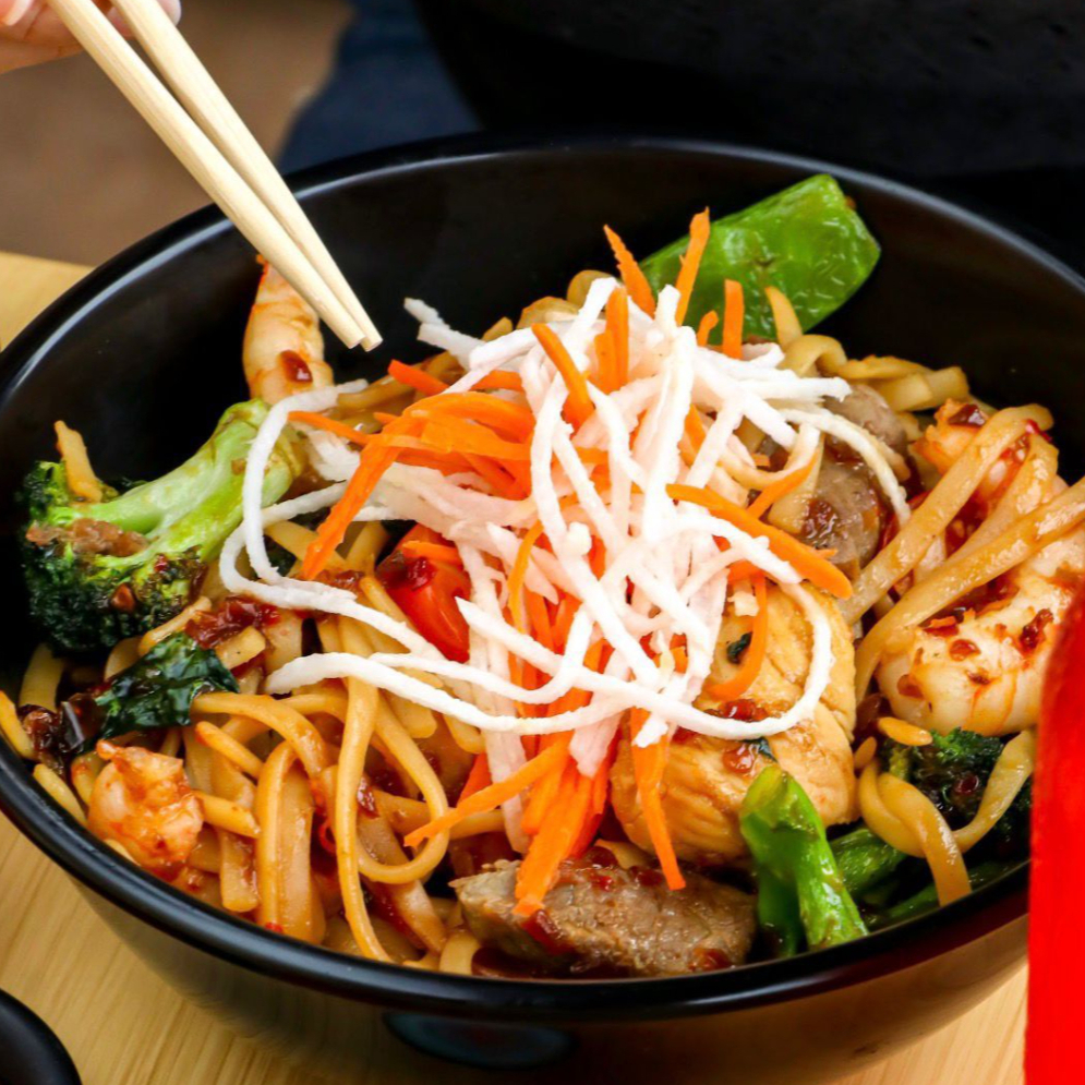 Pasta oriental con pollo y carne a la plancha, brócoli, zanahoria, pimiento rojo y sazonada con salsa especial.