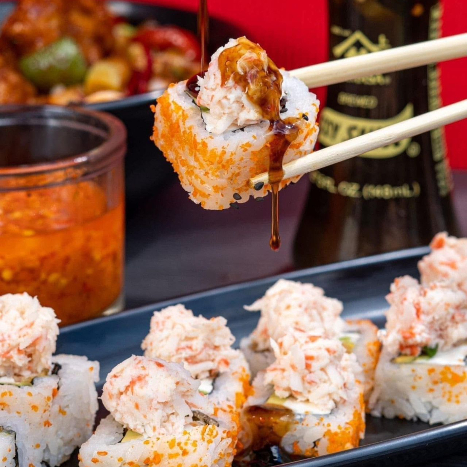 Salmon, queso crema y aguacate por dentro, por fuera mazago y una torre de surimi frito, mezclado con un aderezo roca y decorado con cebollin.