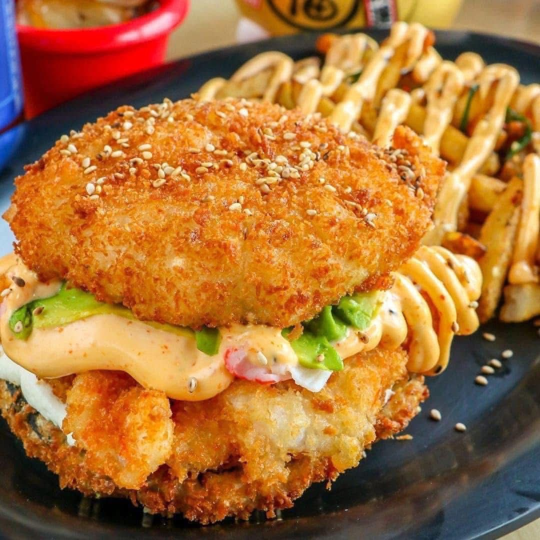 BASE DE QUESO CREMA CON CAMARON EMPANIZADO, KANIKAMAAGUACATE, ADEREZO CHIPOTLE, ENTRE DOS PANES HECHOS DE ARROZ. ACOMPAÑADO DE PAPAS ORIENTALES
