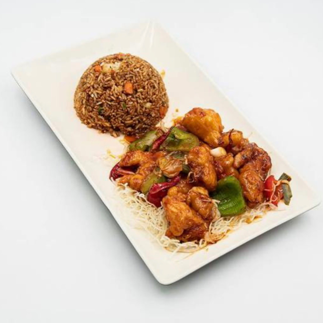 Crujiente pollo salteado en salsa kung pao, agridulce y ostion, acompañado de morron verde y rojo con un toque de chile de árbol, todo esto sobre una cama de arroz frito
