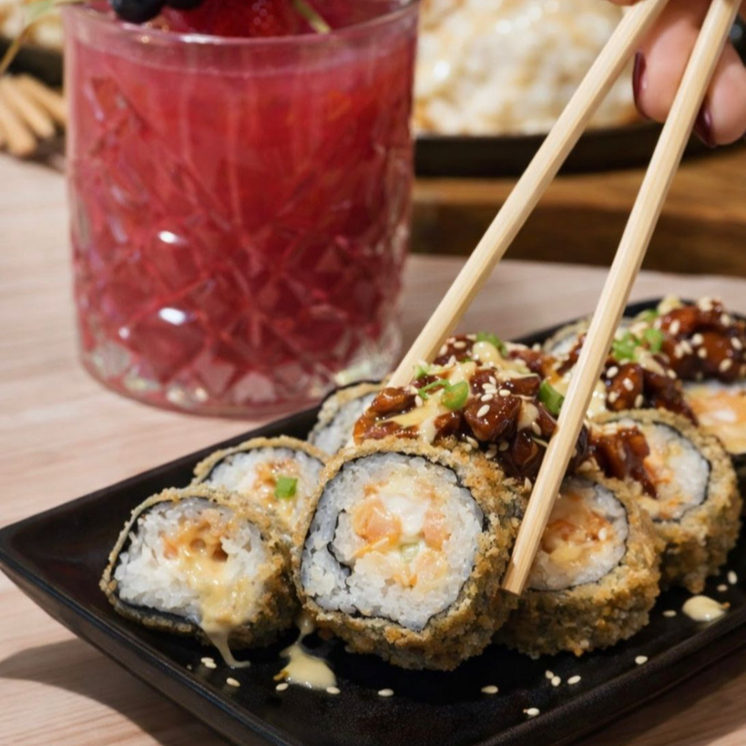 Pasta surimi, pepino, aguacate por dentro, ajonjoli dorado por fuera
