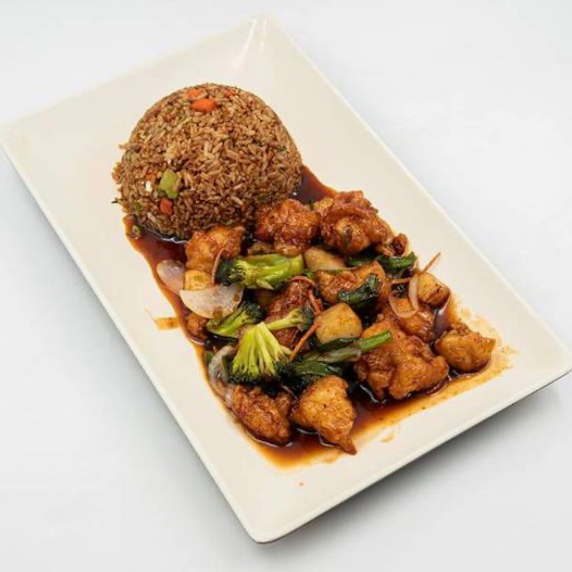 Deliciosos trozos de pollo acompañados de brócoli, jicama, cebolla cambray y cáscara de naranja salteados en una riquísima salsa de naranja. Incluye arroz blanco o frito