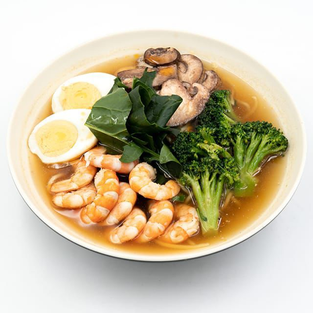 Sopa ramen con camaron, acompañada de huevo cocido, espinacas, champiñones, brócoli y naruto.