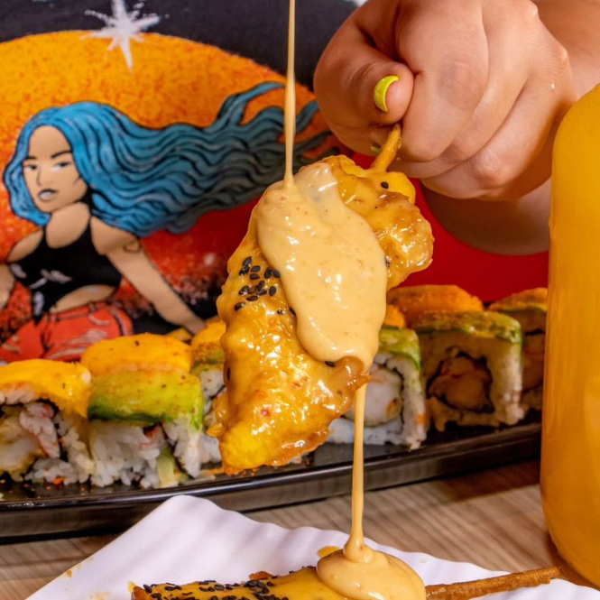 Camaron tempura, aguacate, queso crema y chipotle por dentro, mazago por fuera y decorado con pasta tampico.