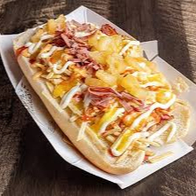 Salchicha de pavo, tomate, cebolla caramelizada, mayonesa, catsup, mostaza, piña, tocino, queso cheddar y salsa picante.
