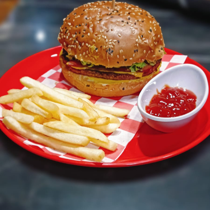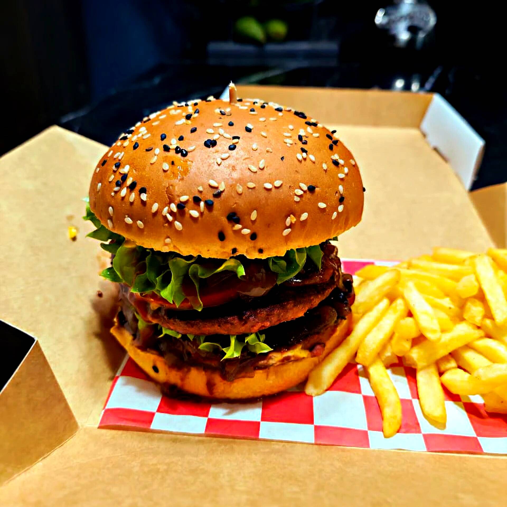 HAMBURGUESA DOBLE CARNE DE RES CON QUESO AMERICANO Y TOCINO FRITO, TOMATE, CEBOLLA CARAMELIZADA, LECHUGA Y PEPINILLOS (SALSA CATSUP, MAYONESA Y MOSTAZA), ACOMPAÑADO DE PAPAS A LA FRANCESA
