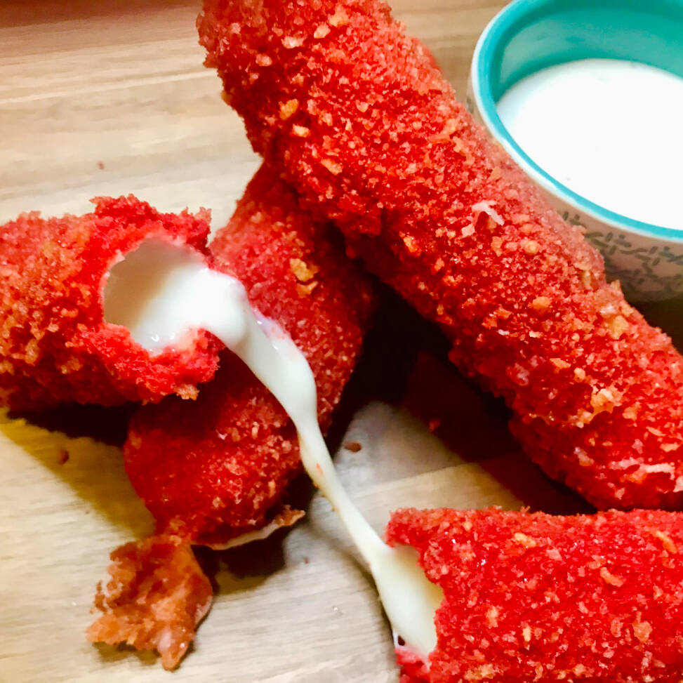6 DEDOS DE QUESO MOZZARELLA, EMPANIZADOS DE FLAMING HOT Y ACOMPAÑADO DE QUESO AMARILLO FUNDIDO