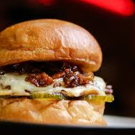 PAN BRIOCHE, CARNE DE RES, MERMELADA DE BACÓN, QUESO DERRETIDO, ADEREZO DE LA CASA, PEPINILLOS