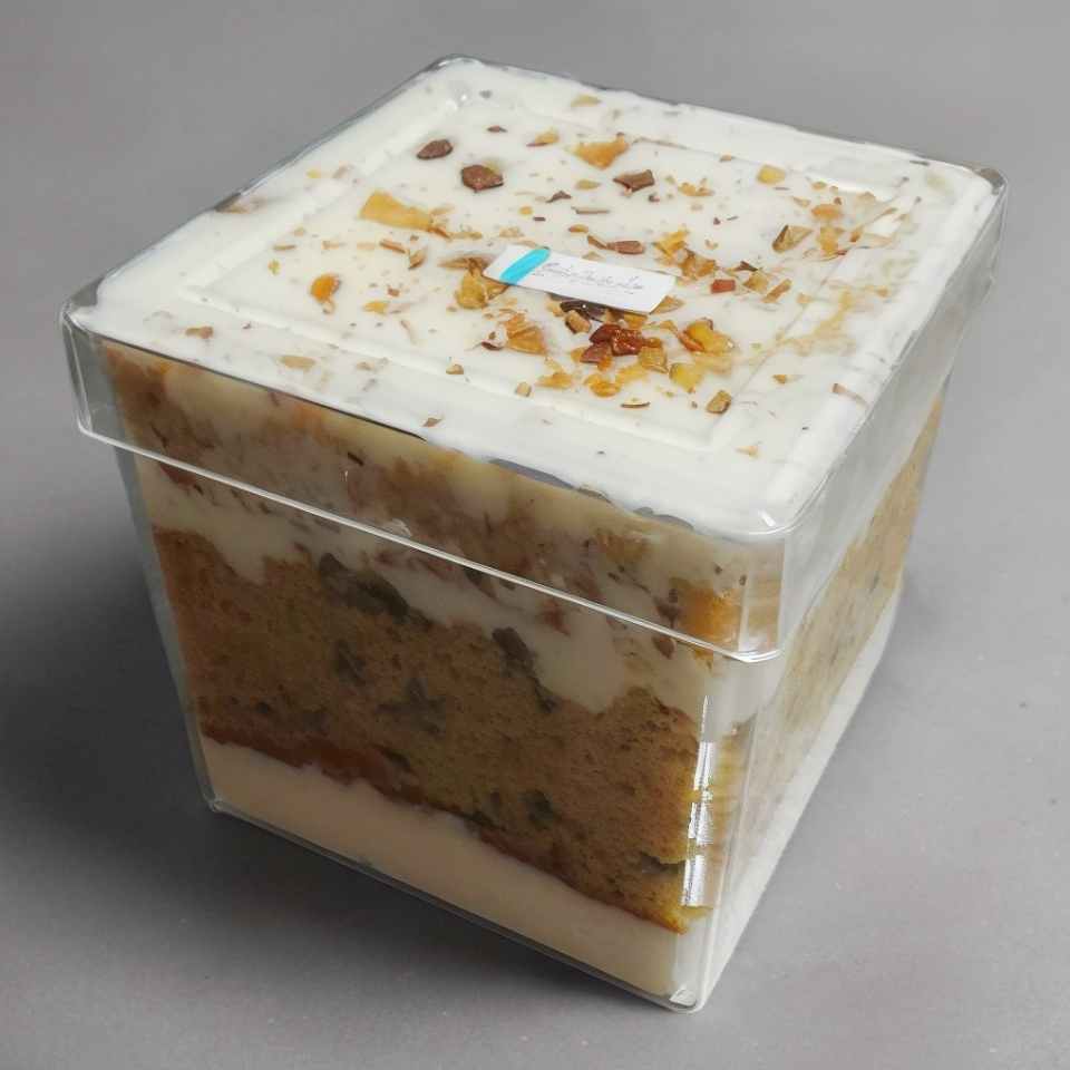 Pastelito individual de zanahoria con aguamiel de naranja y crema de queso, en cajita transparente.