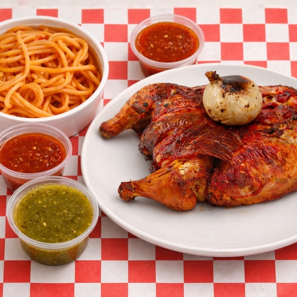 Pollo horneado con cebolla, spaghetti y salsa de la casa