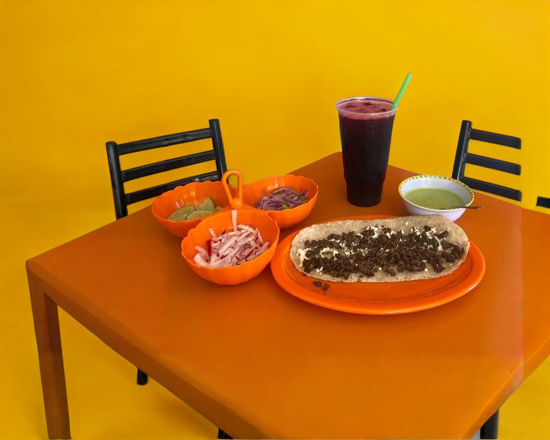 Tacos de carne asada, acompañados con ensalada de rabano y cebolla morada y salsa con o sin picante