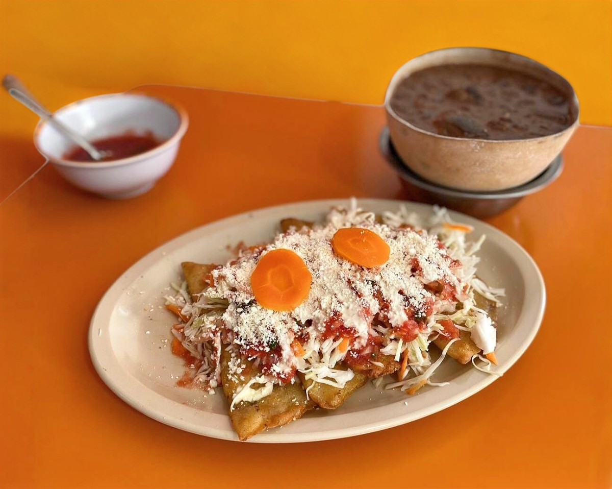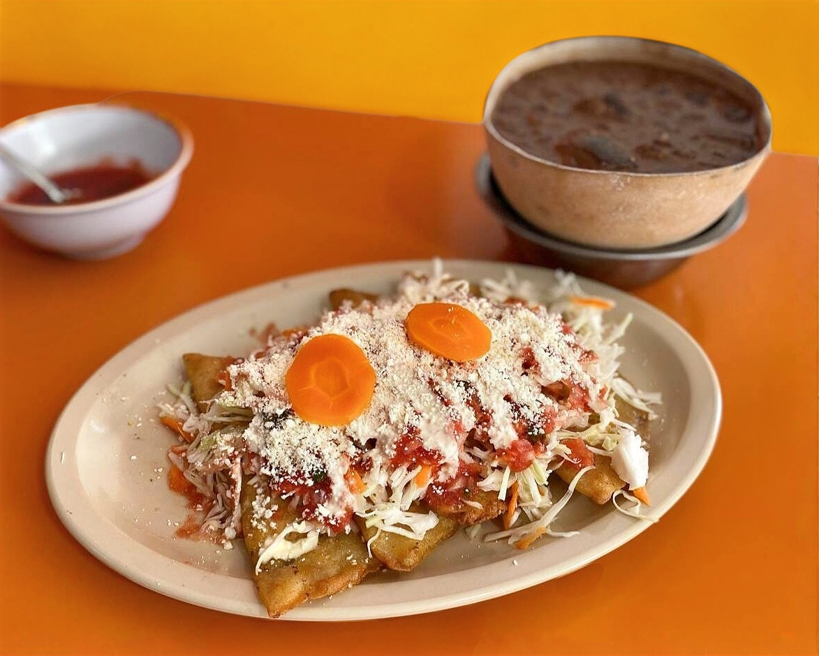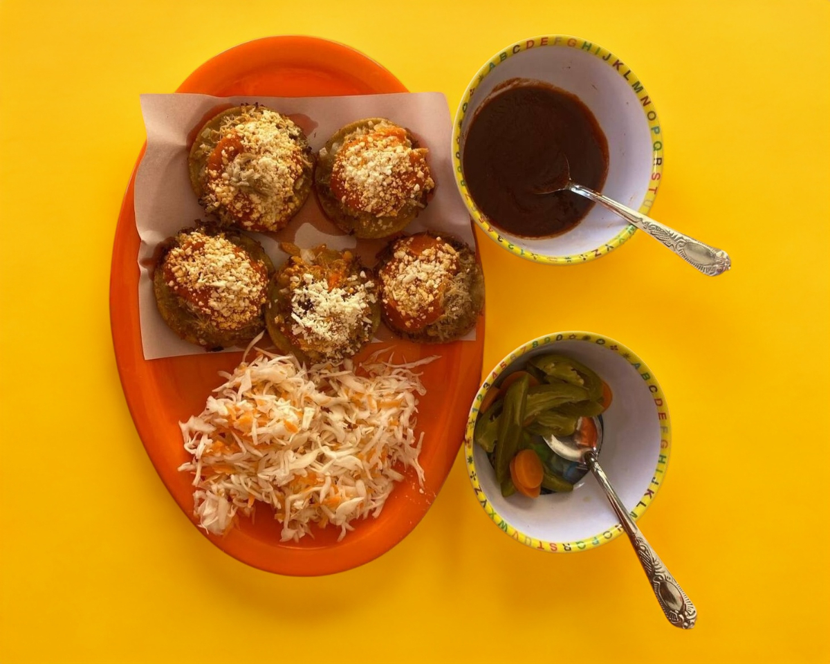 Orden de garnachas con 5 Pz, con carne de res con cebolla picada, salsa de tomate, queso y acompañadas de repollo envinagrado y chile de rajas con chipotle