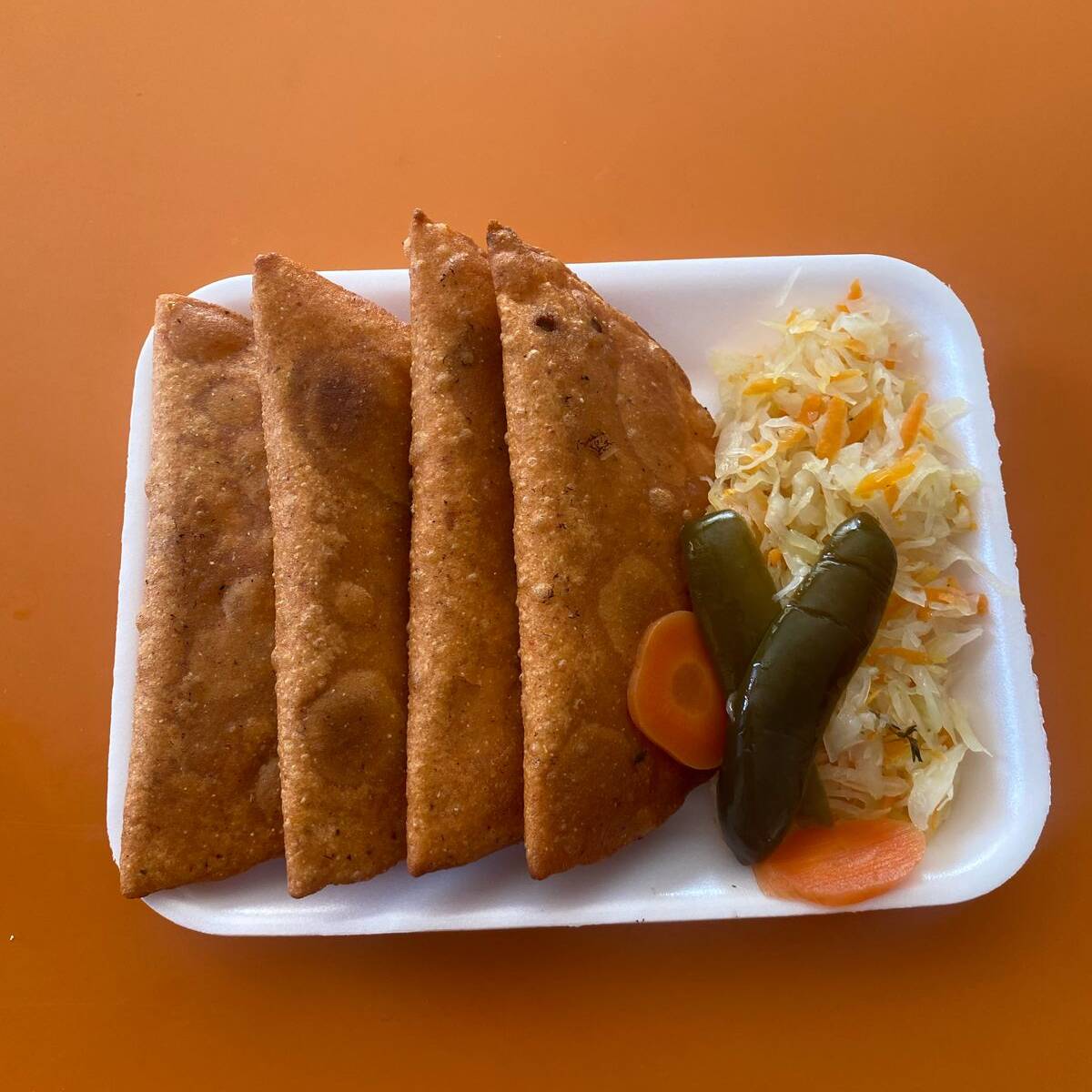 Orden de 4 pz de empanadas de Cazón (pescado) acompañado de ensalada de repollo con aderezo