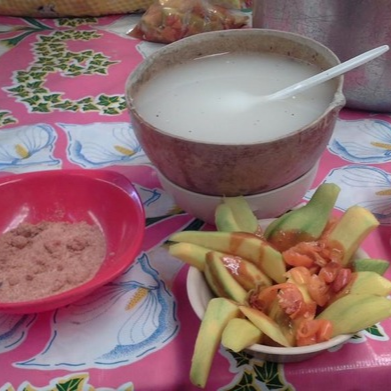 Pozol de Cacao servido en bolsita, acompañado de su botana de mango o pepino