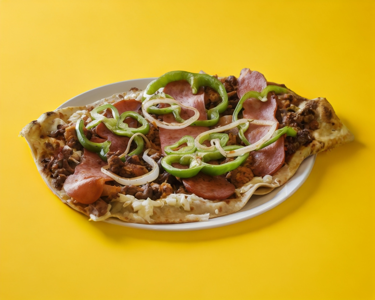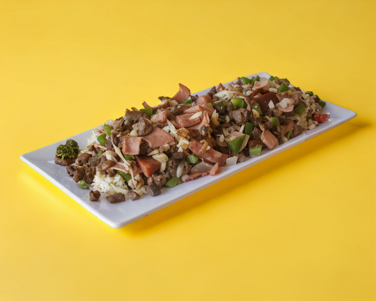 Alambre de bistec, tocino, jamón, cebolla, pimiento morron y quesillo.