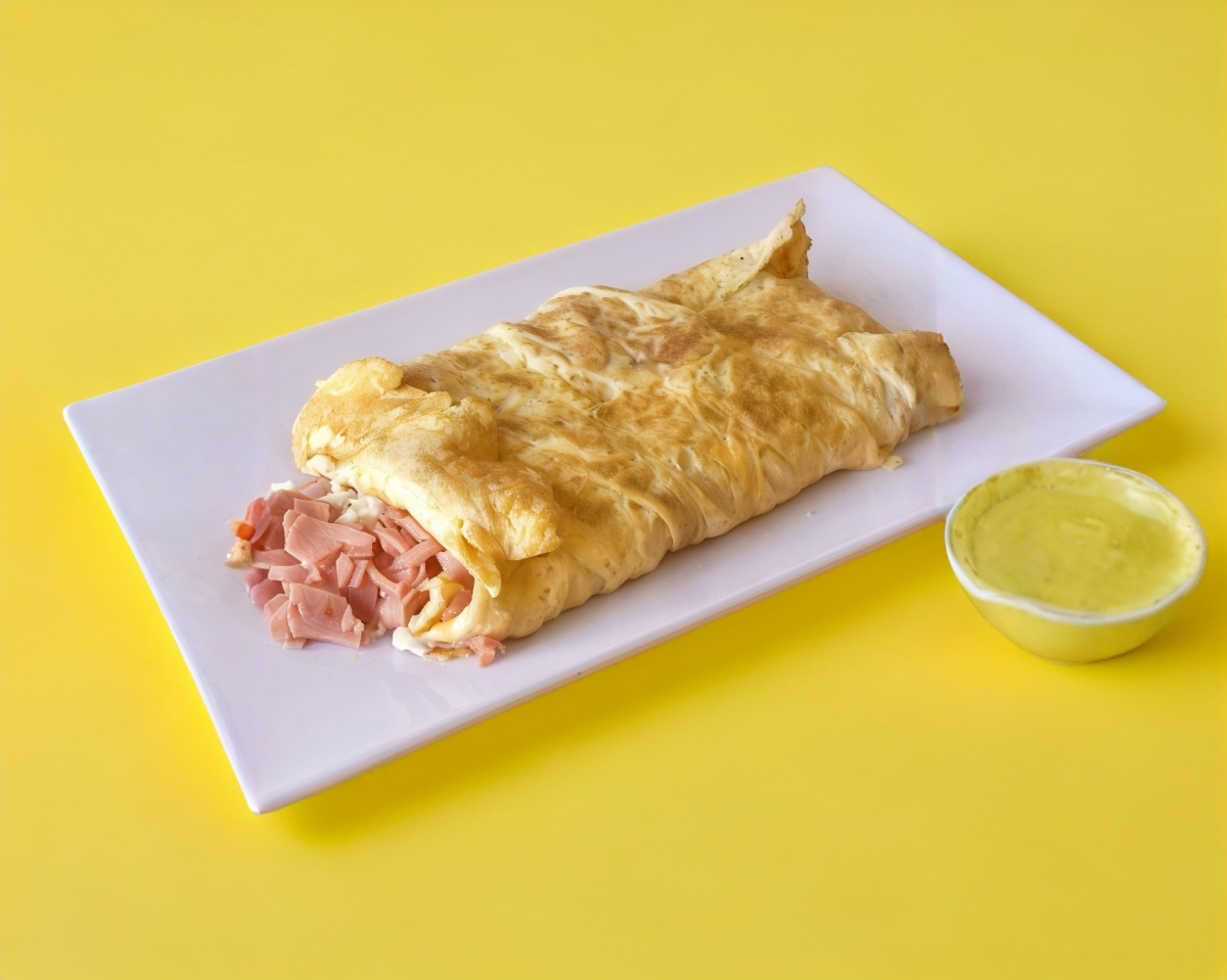 Dos tortillas de harina rellenas de jamón, quesillo, queso amarillo y aguacate.