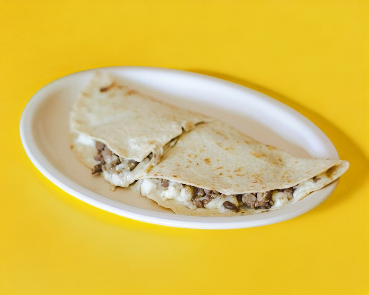 Dos tortillas de harina rellenas de bistec, quesillo, queso amarillo y aguacate.