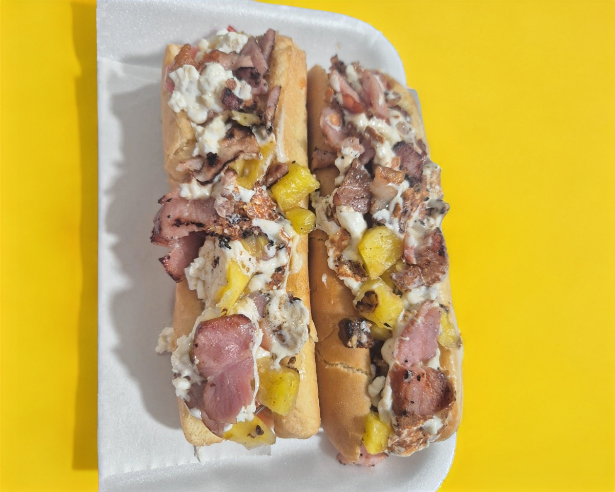 Salchicha, tocino, quesillo, piña, tomate, queso amarillo, cebolla, mayonesa y catsup