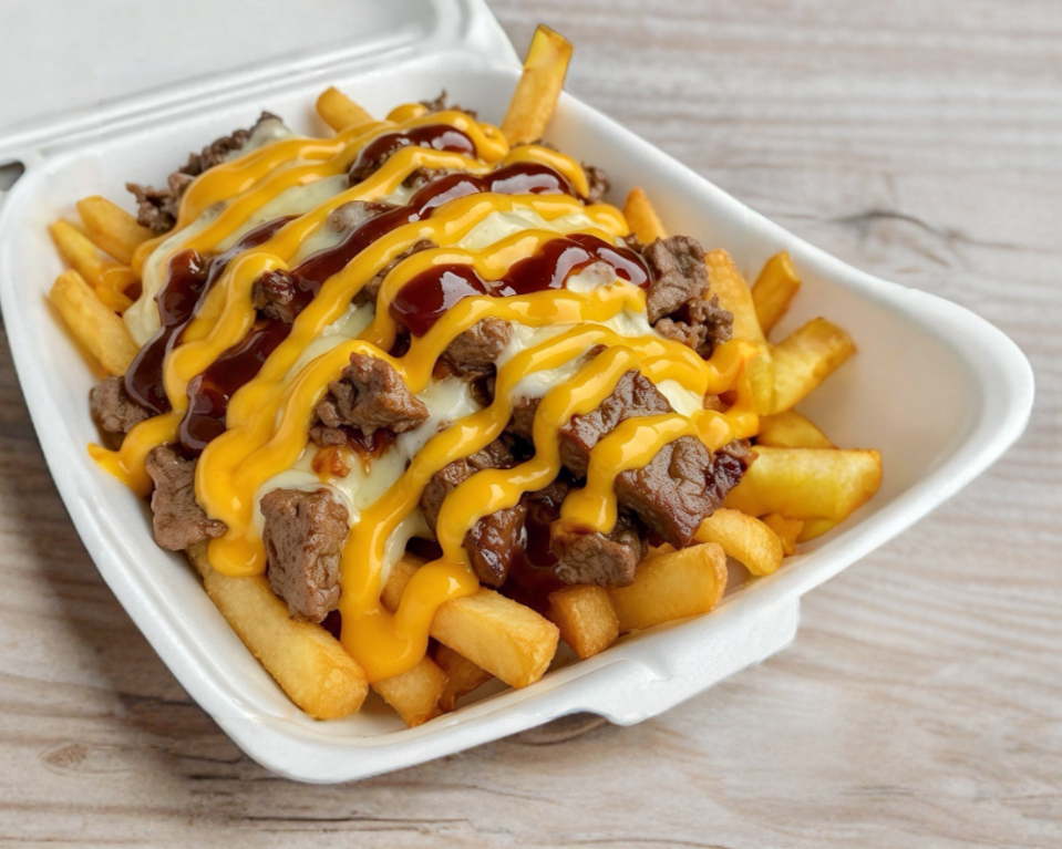 Orden de papas fritas, carne arrachera, quesillo, queso amarillo & salsa BBQ.