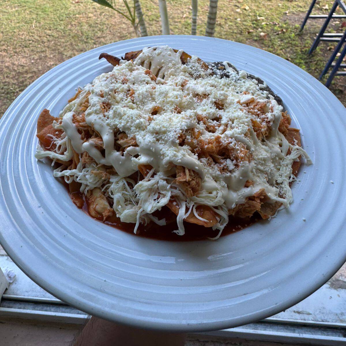 salsa de tomate roja, quesillo, pollo, queso y crema. Acompañado de plátanos fritos y frijoles