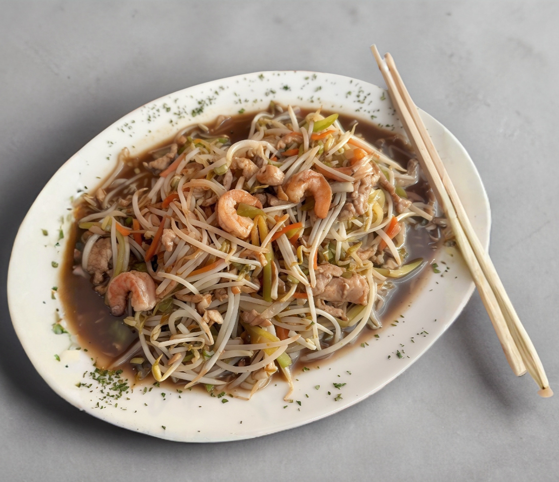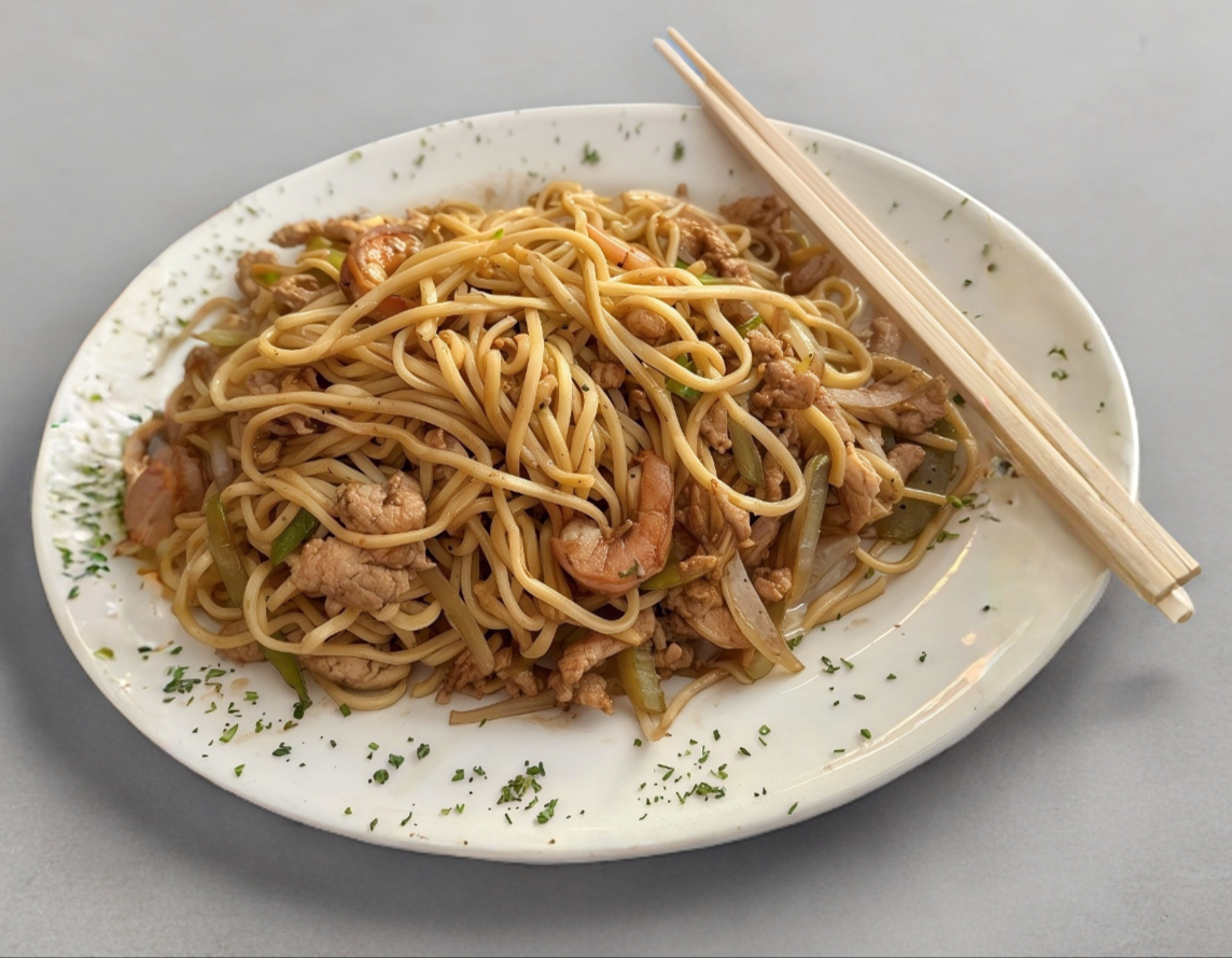 Fideos de la casa, vegetales, pollo, cerdo y camarón