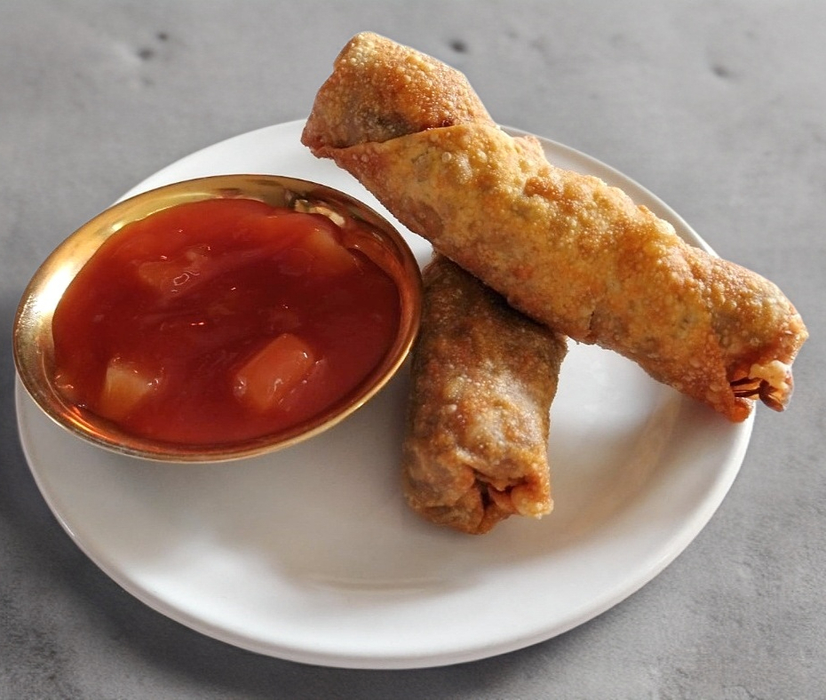 Rollo frito relleno de verduras y carnes, salsa agridulce, 4 piezas.