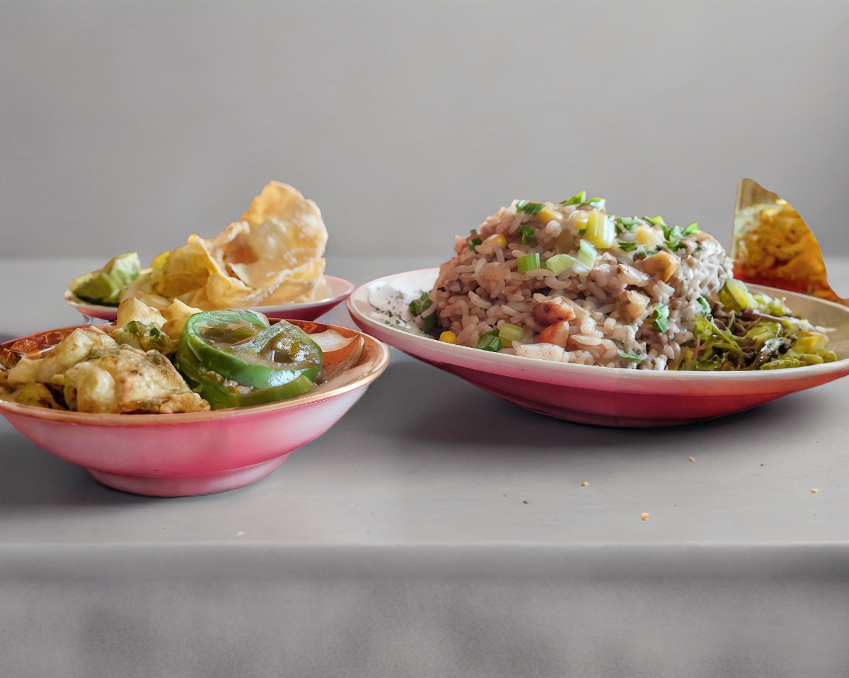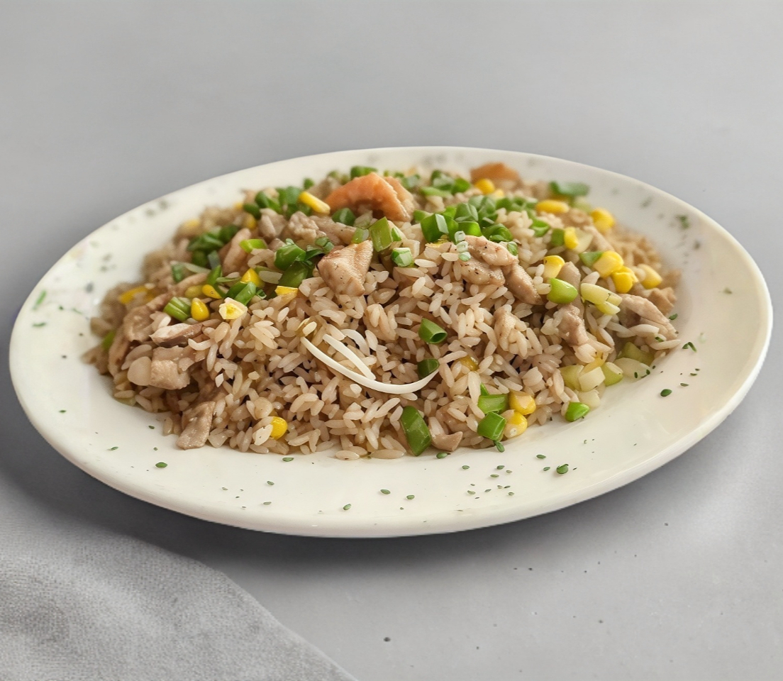 Arroz frito con vegetales picados y un toque de elotes; lomo, pechuga y camarón.