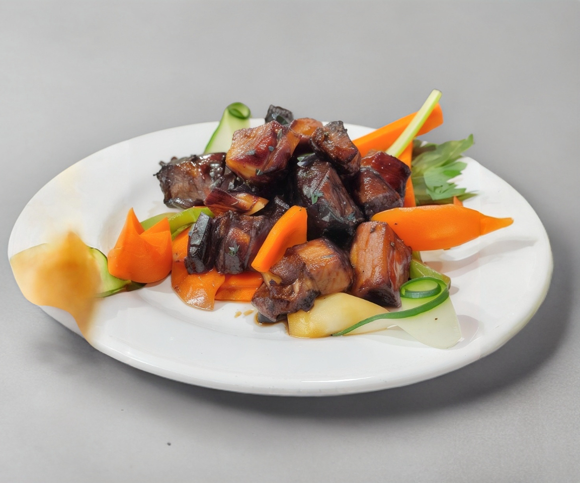 Costillas de cerdo acompañadas de verduras cantonesas y bañadas en salsa agridulce
