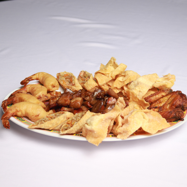 Rollos Primavera, Alitas, Ravioles, Costilla frita, Camarón empanizado.