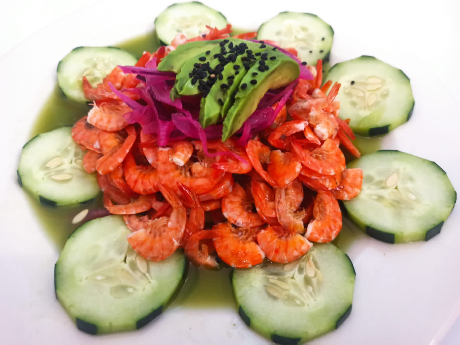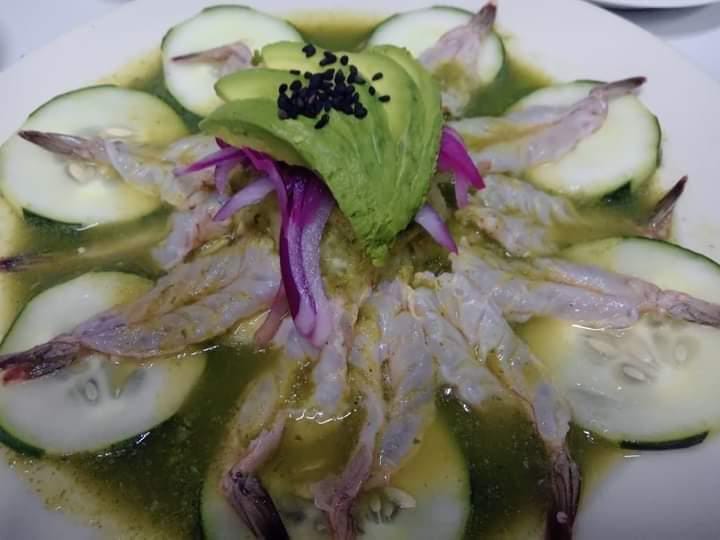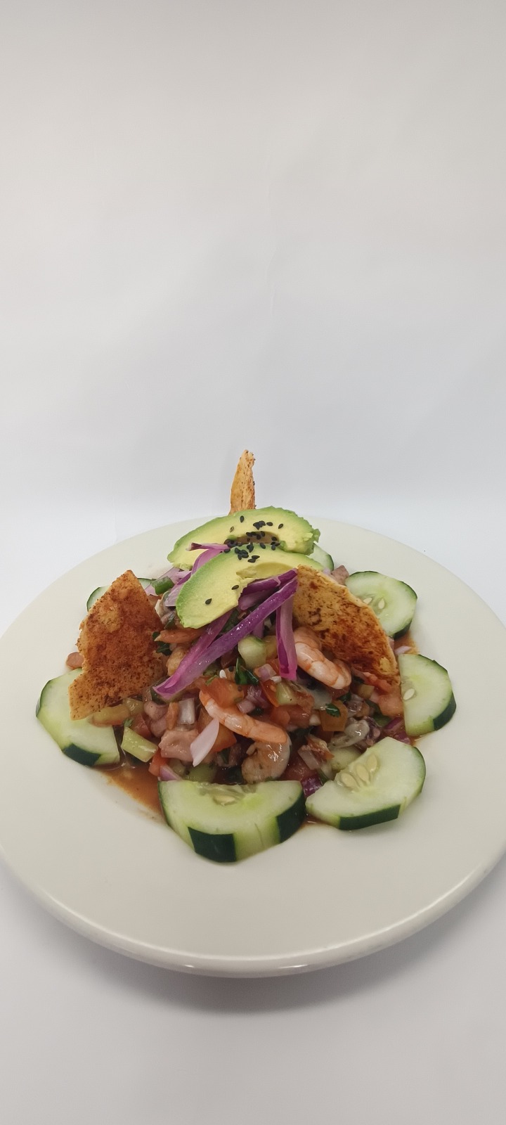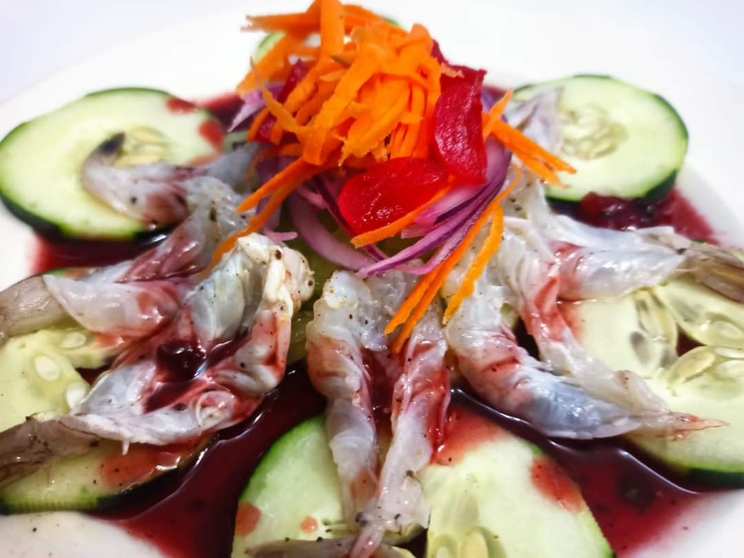 Con pulpa de camarones con frutos rojos marinados en jugo de limón y chiles, con ingredientes frescos como cebolla morada y pepino.