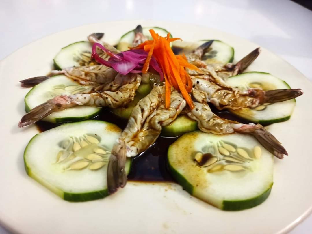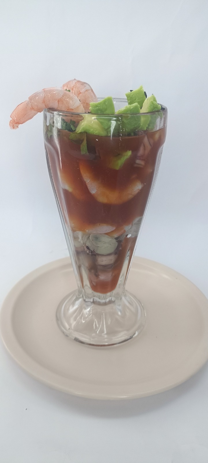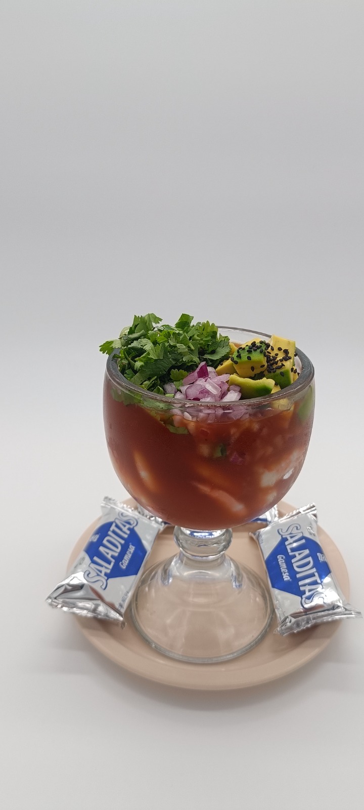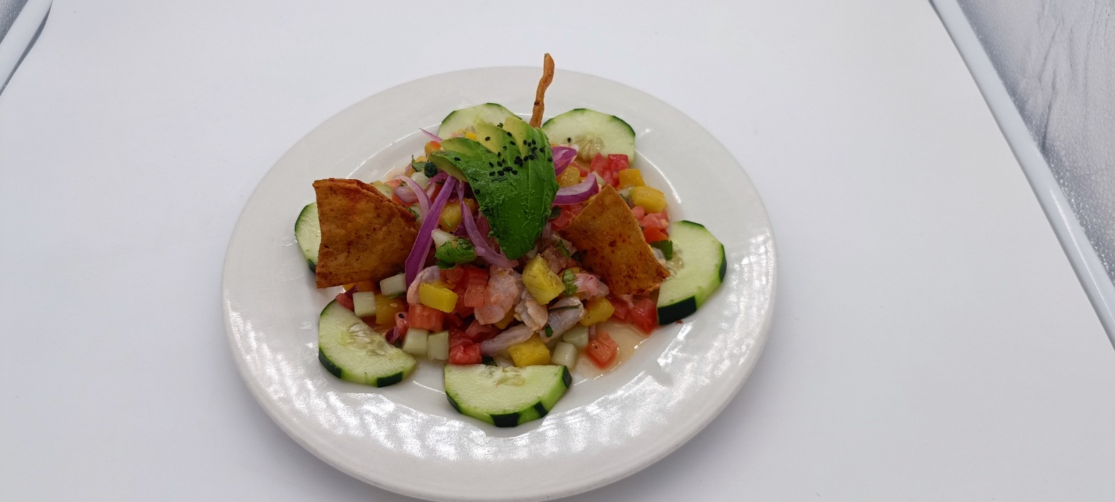 Con pulpa de camarones con frutos rojos marinados en jugo de limón y chiles, con ingredientes frescos como cebolla morada y pepino.