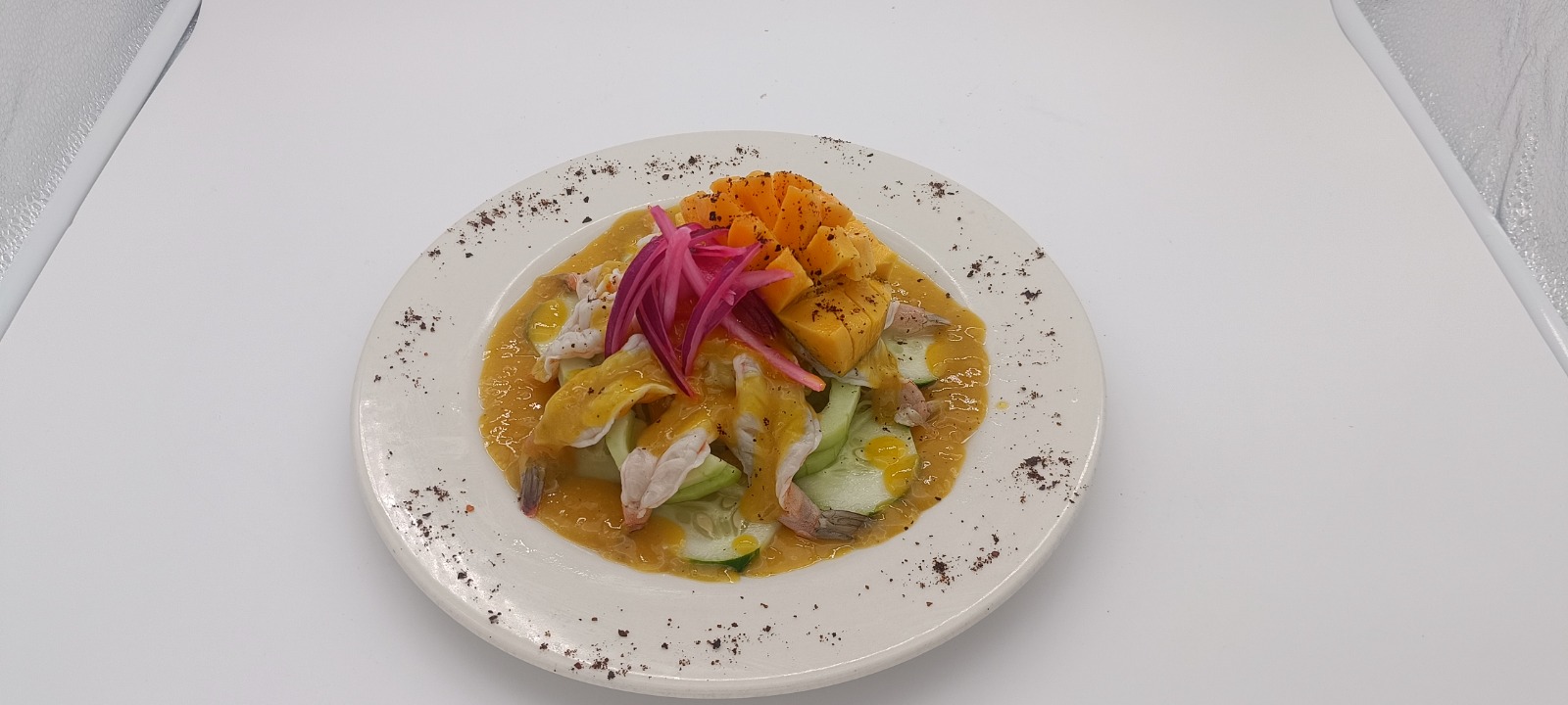 Camarones con mango marinados en jugo de limón y chiles, con ingredientes frescos como cebolla morada y pepino.