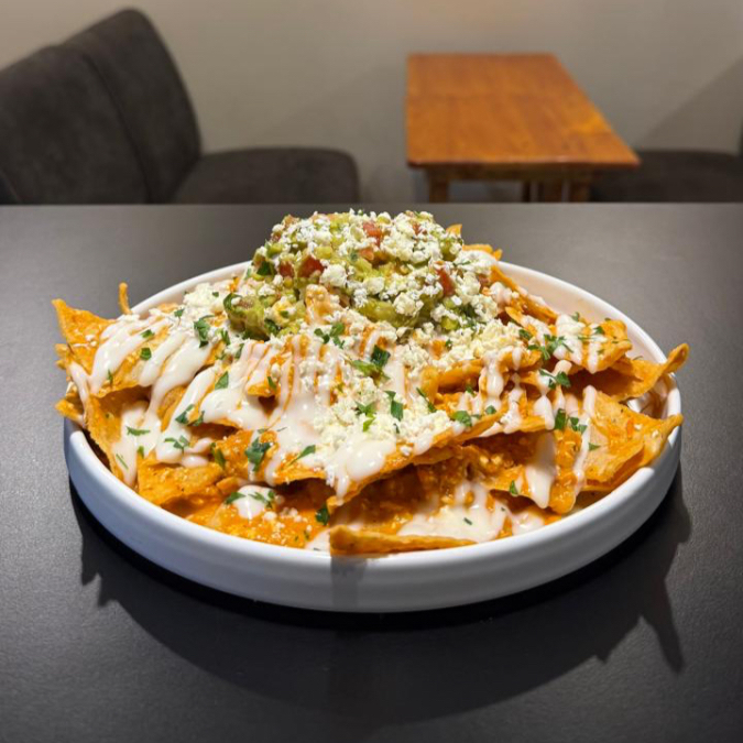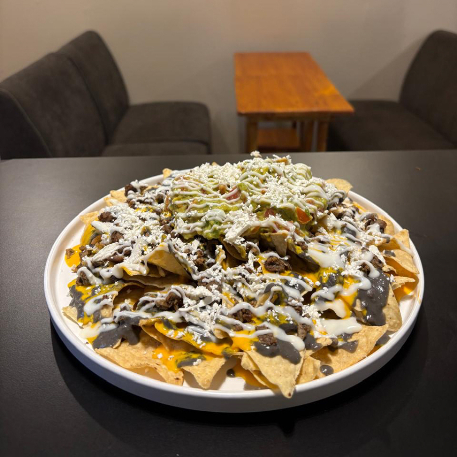 TOTOPOS, FRIJOLES REFRITOS, QUESO AMARILLO FUNDIDO, QUESO CHIAPAS, CREMA ACIDA, GUACAMOLE CON PICO DE GALLO Y PROTEINA CON COSTO EXTRA