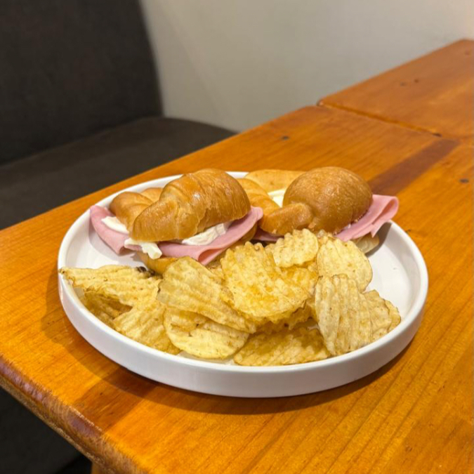 Un cuernito con jamón, queso crema y aderezo de chipotle, acompañado de papas