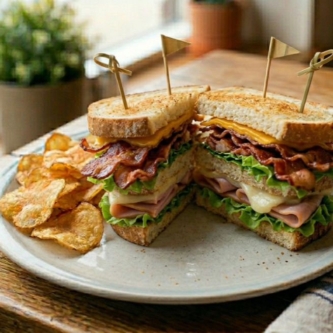 REBENADAS DE BRIOCHE DE LA CASA, TOCINO, JAMON DE PIERNA, QUESO MANCHECO, QUESO AMARILLO, LECHUGA, TOMATE Y MAYONESA
