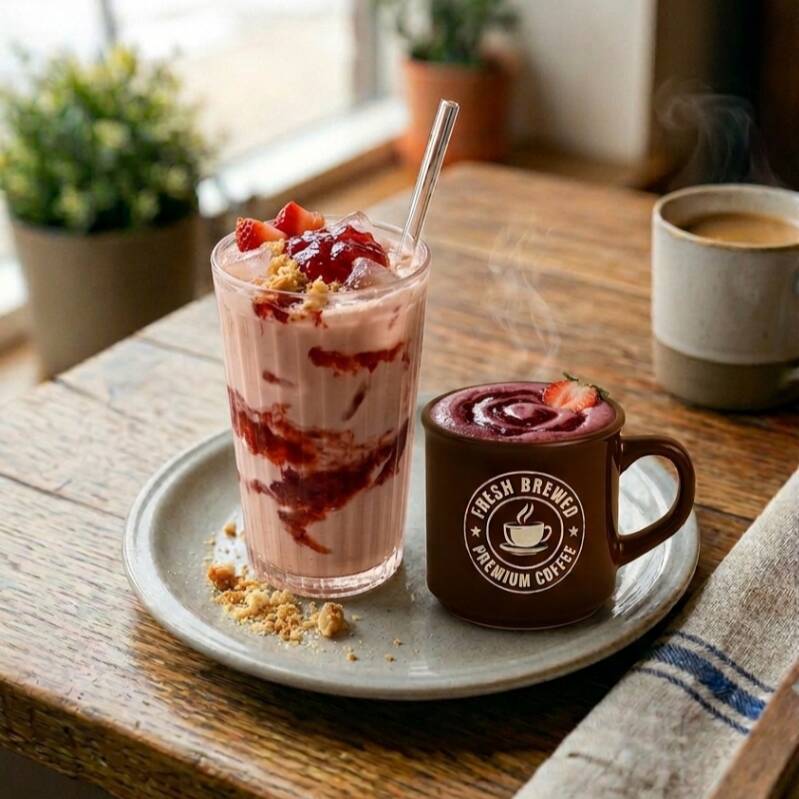 BEBIDA REFRESCANTE O CALIENTE CON FRESA Y CAFE