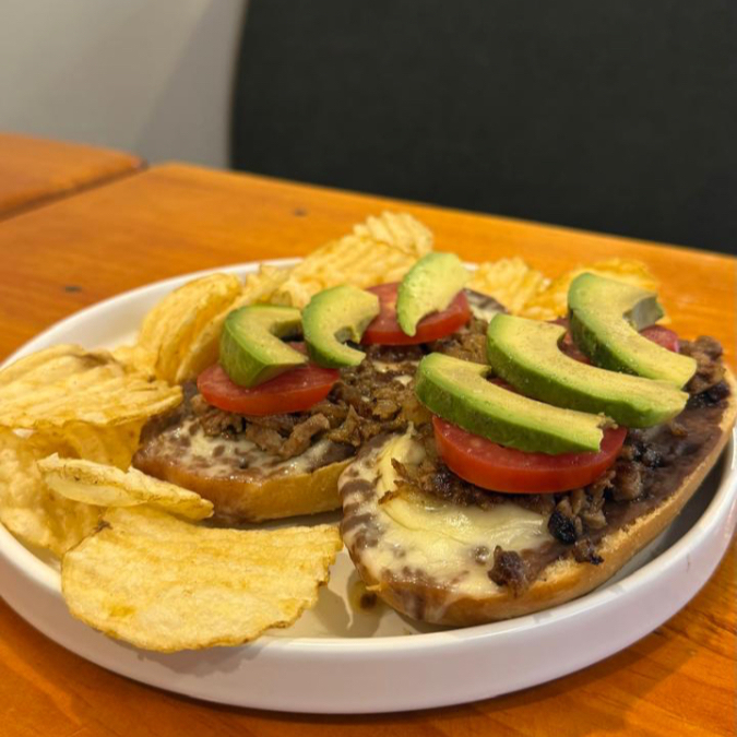 1 Brioche de la casa, frijoles refritos, queso manchego, guacamole con pico de gallo, y proteína con costo extra