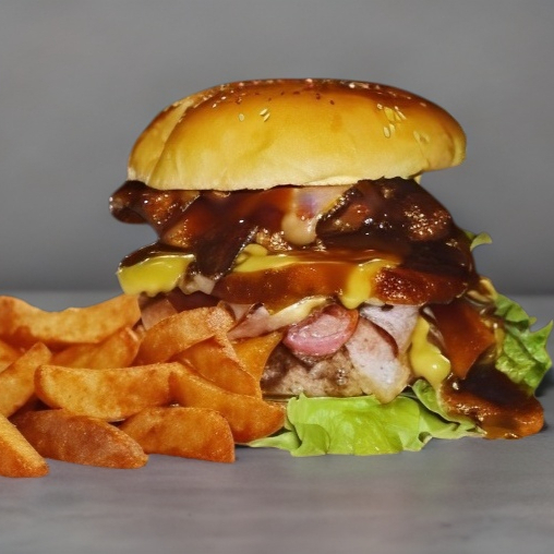 Doble carne jugosa de res, doble tocino, queso americano, queso manchego, chorizo argentino, aros de cebolla y aderezo BBQ. Incluye porción individual de papas gajo.